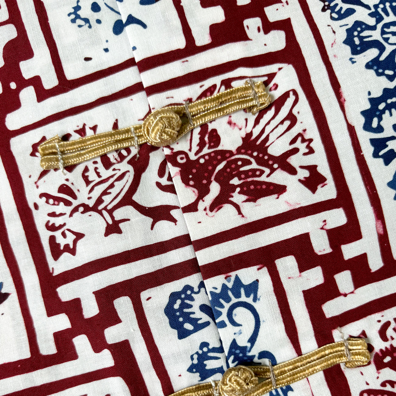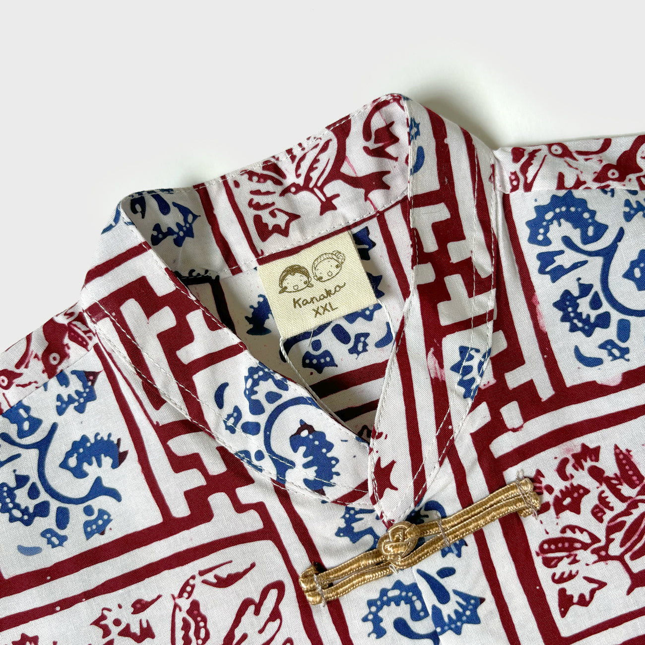 Complete your family's festive look with our Little Jade Boy's Batik Shirt! A fresh spin on Chinese heritage that pairs perfectly with our cheongsam collection. It features the same hand-stamped batik prints with birds and florals in classic blue and maroon, arranged in our contemporary grid pattern.