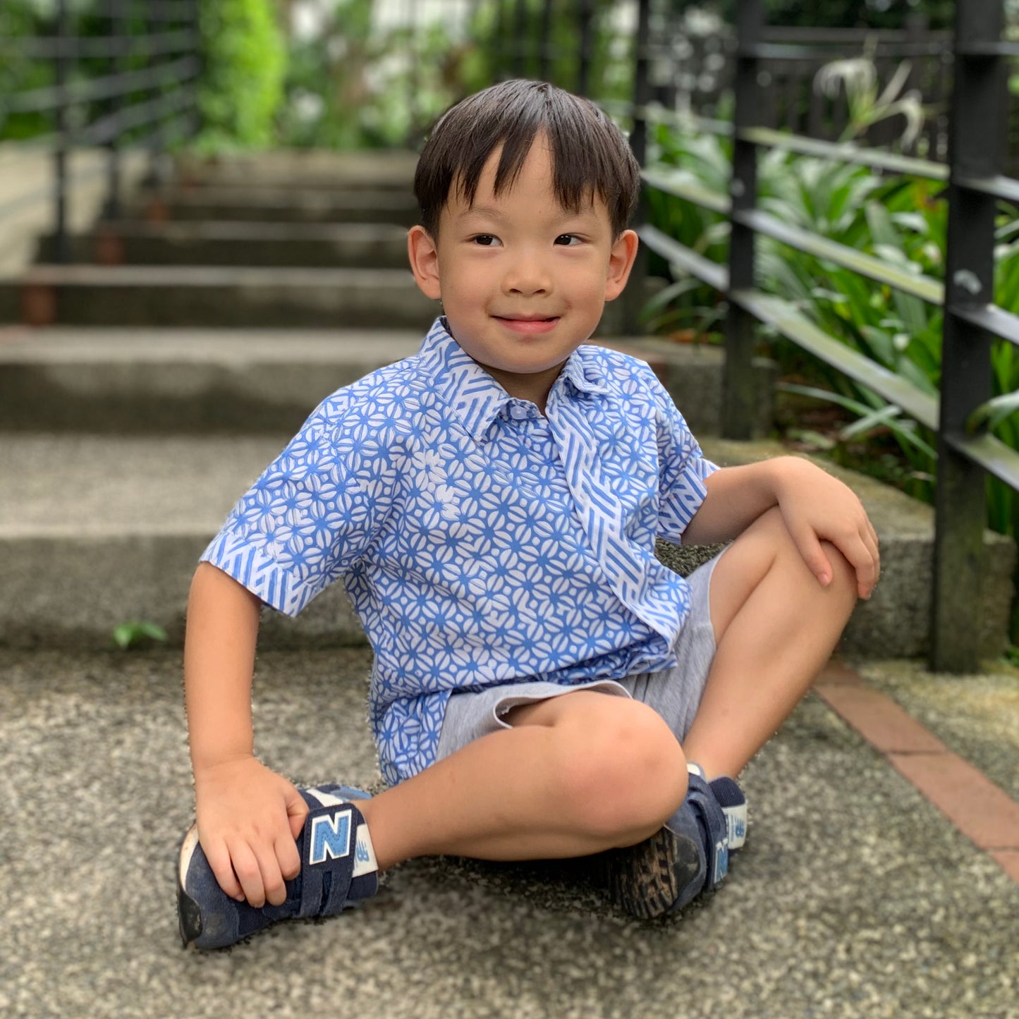 A vibrant blue batik shirt with alternate patterns throughout the collar, button placket, and sleeves. Great for dress-up school days or family photos.