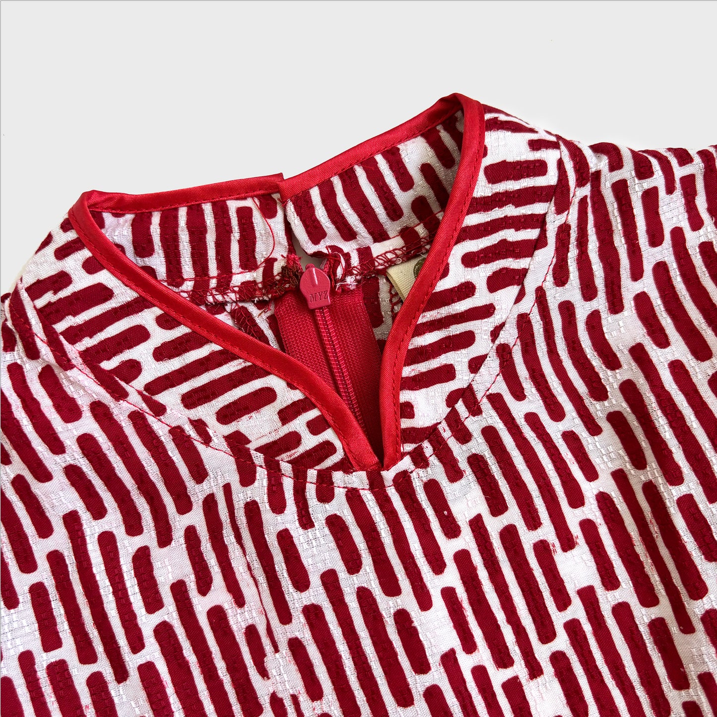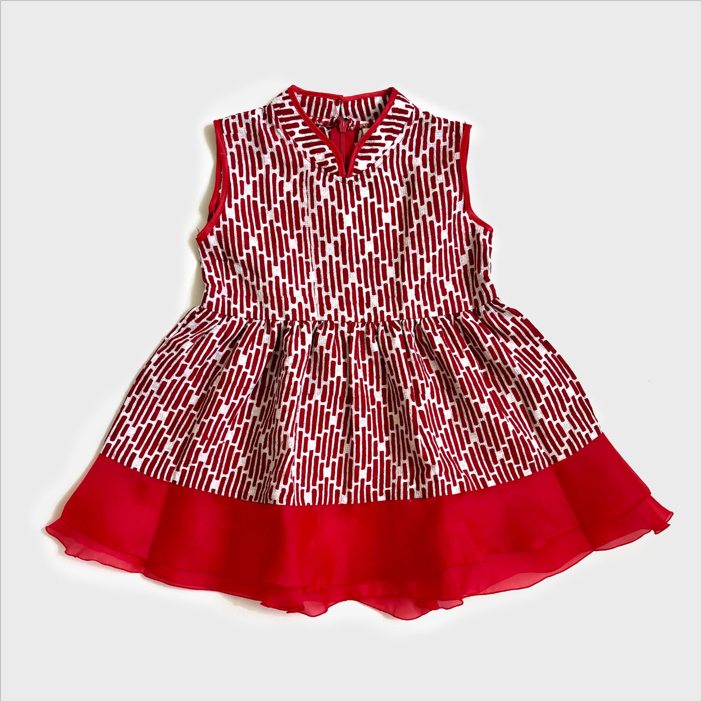 Our Rui Red Cheongsam Batik Dress comes with a lower cut mandarin-inspired neckline and a batik pattern of simple hand drawn strokes. It also features a flare bottom that falls just above the knee, accented with touches of red.