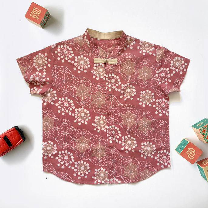 Who said boys can't wear pink? Usher in Chinese New Year with our Sakura Pink Batik Shirt for little boys who love color! Featuring a gold-accented mandarin collar and a Chinese knot button, this shirt is perfect for family celebrations and running around with friends!